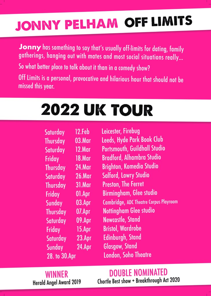 One of the most exciting stand-up comedians on the circuit, Jonny Pelham (Live at the Apollo, Mock The Week, Alan Davies As Yet Untitled) brings his critically acclaimed 2019 Edinburgh Festival Fringe show, Off Limits, to venues nationwide for 2022, including three dates at London’s Soho Theatre, as part of his debut UK tour.