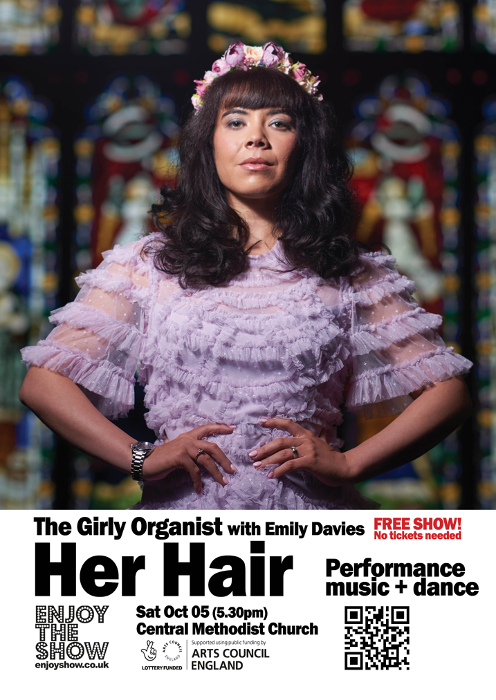 Mixing an organ recital with video installation and live dance performance by Emily Davies, Her Hair is about the cultural experience of a mixed race girly in Lancashire.